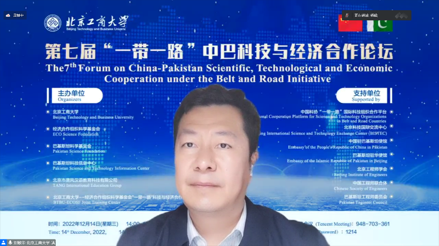王慶林在致辭中表示,秉持以科學(xué)繁榮發(fā)展造福各國(guó)人民的理念,中國(guó)科協(xié)高度重視與世界各國(guó)的科技合作和人文交流,致力于增進(jìn)科技界的開(kāi)放、信任、合作,推動(dòng)構(gòu)建全球科技共同體。2016年中國(guó)科協(xié)啟動(dòng)實(shí)施了“一帶一路”國(guó)際科技組織合作平臺(tái)建設(shè),吸引了200多個(gè)國(guó)際組織和150多個(gè)國(guó)家的1000多個(gè)國(guó)別組織和機(jī)構(gòu)參與,成為了全球科技界開(kāi)展科技人文交流與合作的重要支撐平臺(tái)。北京工商大學(xué)巴基斯坦科技與經(jīng)濟(jì)研究中心是第一批獲得“一帶一路”國(guó)際科技組織合作平臺(tái)建設(shè)項(xiàng)目資助的國(guó)別研究中心。中巴兩國(guó)是親如兄弟的友好鄰邦。在11月巴基斯坦總理夏巴茲閣下訪華期間,習(xí)近平主席強(qiáng)調(diào),近年來(lái)兩國(guó)在世界變局亂局中相互支持、砥礪前行,彰顯中巴“鐵桿”情誼。中國(guó)科協(xié)也將以實(shí)際行動(dòng)落實(shí)兩國(guó)領(lǐng)導(dǎo)人的會(huì)晤精神,在工作中持續(xù)推動(dòng)構(gòu)建中巴命運(yùn)共同體。