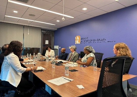 在紐約訪問(wèn)期間,代表團(tuán)一行前往位于紐約州首府所在地的紐約州立大學(xué)奧爾巴尼分校,與該校教務(wù)長(zhǎng)卡洛·金(Carol H.Kim)、副校長(zhǎng)法丁·薩拉(Fardin Sanai)、商學(xué)院院長(zhǎng)丹尼斯·卡普蘭(Dennis Caplan)、國(guó)際教育與全球戰(zhàn)略部主任瑞秋·穆迪(Rachel Moody)、金融學(xué)院副院長(zhǎng)瑞塔·比斯沃斯(Rita Biswas)、會(huì)計(jì)與法學(xué)系副教授蓋·弗蘭多(Guy Fernando)等進(jìn)行會(huì)談。黃先開(kāi)指出,北工商正在全面推進(jìn)與美國(guó)高校的雙邊合作和交流,積極促進(jìn)中美高校間的人文交流和師生往來(lái)。兩校學(xué)科設(shè)置相近,發(fā)展重點(diǎn)也有很多相同之處,希望雙方充分發(fā)揮在商科領(lǐng)域和教育數(shù)字化領(lǐng)域的學(xué)科優(yōu)勢(shì),推動(dòng)雙方的深入交流和共同發(fā)展。會(huì)談期間,黃先開(kāi)代表學(xué)校與該校簽署校際合作協(xié)議,雙方將圍繞更多優(yōu)勢(shì)領(lǐng)域開(kāi)展務(wù)實(shí)合作。