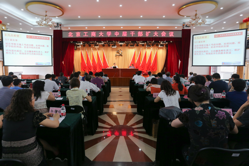 孫寶國校長通報了學校領導班子考核情況,通報了北京市委組織部關于學校第二次黨代會的批復,簡要總結了本學期的工作,并對近期工作進行了部署。他談到,本學期學校順利召開第二次黨代會,確立了“特色,內涵,規范,質量”的“八字”方針,凝聚了共識,指明了發展方向。學校要找準特色,努力打造商科、輕工、食品等專業,做到人無我有,人有我強。他強調,學校必須始終堅持把提高人才培養質量為一切工作的出發點和落腳點,整體推進全體本科專業建設工作,重點突破一級學科博士點建設工作。他指出,學校畢業生質量穩步提升,特別是本科生考研率和升學率相比五年前,增加了8個百分點,學校在高校畢業生質量排行榜的排名不斷提升,希望大家要樹立更高的目標,全面提升人才培養質量。他部署了學校近期主要工作安排,要求做好安全穩定和防汛工作、學生搬回阜成路校區和新生宿舍安排、暑期學生社會實踐、本科生招生、研究生和留學生招生、各單位十三五規劃編制、科研項目申報、基建、專項資金使用、學校網站和二級網站建設工作以及新生報到、開學典禮等各項工作。他強調全體中層干部假期要保持手機暢通,履行離京請假手續,確保假期和開學前的各項工作。