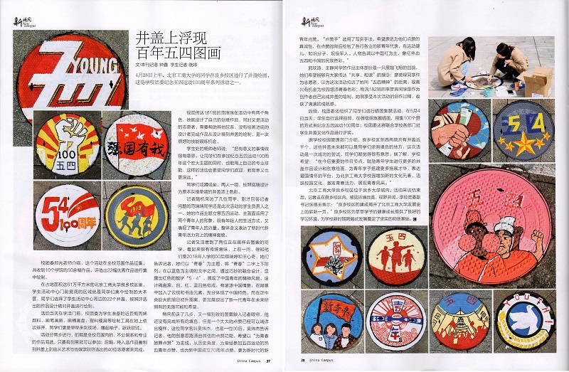 《大學(xué)生》雜志2019年6月版的新校園專欄以《井蓋上浮現(xiàn)百年五四圖畫》為題報(bào)道了北京工商大學(xué)團(tuán)委紀(jì)念五四運(yùn)動(dòng)100周年系列活動(dòng)之“青春·藝術(shù)”活動(dòng),內(nèi)容如下: