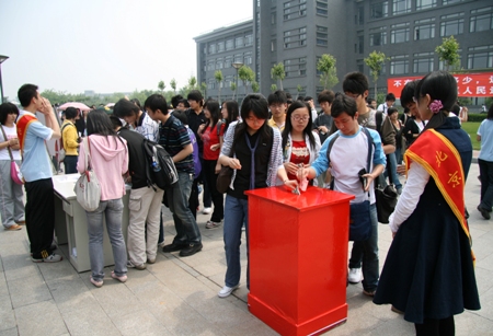 在捐款現(xiàn)場,我們看到有很多是以班級或集體為單位進行捐款的,其中有機械054班、藝設(shè)062班、營銷051和052、法學(xué)071班等,它們都是利用課間時間,組織大家捐錢的,其中營銷班的同學(xué)們還將賣雜志,拉贊助的錢也捐了出來。奧運會志愿者骨干班也將芙蓉學(xué)子獎學(xué)金5000元全部捐給了災(zāi)區(qū)人民,志愿者骨干班代表李俊向記者介紹道:“作為一名志愿者,我們有義務(wù)向災(zāi)區(qū)人民奉獻我們的愛心,我們希望大家能夠眾志成城,抗擊震災(zāi),錢雖然不多,但是盡了我校奧運志愿者的微薄之力。”信息學(xué)院的學(xué)生會、青志協(xié)、團總支干部,也自發(fā)集體捐款,信息學(xué)院還在得知地震發(fā)生后,以最快的時間出了一期海報,鼓勵災(zāi)區(qū)人民挺住,希望他們能夠平安。經(jīng)濟學(xué)院和會計學(xué)院團總支前期也分別在院系組織了捐款活動,捐款金額分別為37000余元和29000余元.