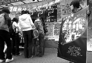 昨日中午,一位女生拿著海報為患白血病的同學彭晨募捐,學生們在一旁捐款并寫下愛心留言。本報記者 孫純霞 攝