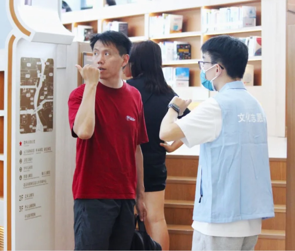 在閱覽區(qū),志愿者們分布在各個(gè)角落,耐心細(xì)致地幫助讀者解決找書(shū)、辦卡等問(wèn)題。