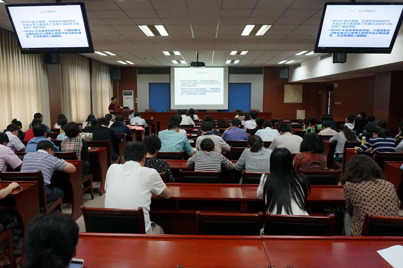 施楓主任以“慕課與翻轉(zhuǎn)課堂”為題,對這種新近涌現(xiàn)出來的在線課程模式進行了全面解讀。施主任從慕課(MOOC)起源的背景和重要意義講起,指出MOOC是高等教育領(lǐng)域最為深刻的技術(shù)變革,之后就慕課的特點和三大平臺進行了細致的講解和對比。