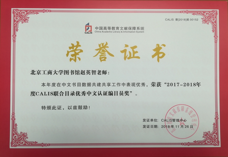 近日,從CALIS聯(lián)機(jī)編目中心傳來喜報,我校圖書館趙英智老師在編目員數(shù)據(jù)質(zhì)量評估中成績優(yōu)秀,被授予“CALIS聯(lián)合目錄中文二級編目員”,同時,在本年度中文書目數(shù)據(jù)共建共享工作中表現(xiàn)優(yōu)秀,榮獲“2017—2018年度CALIS聯(lián)合目錄優(yōu)秀中文認(rèn)證編目員獎”。