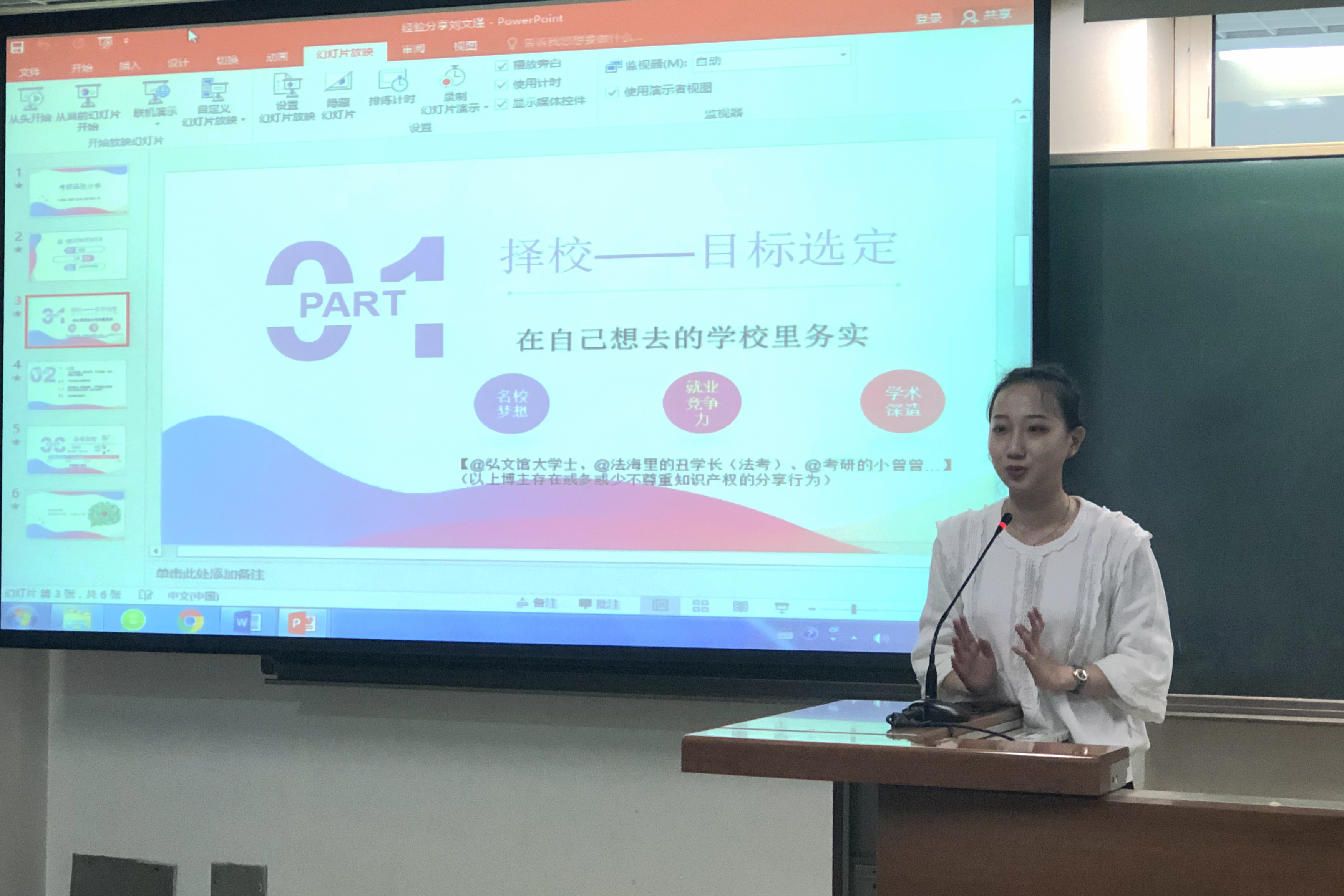隨后,金運、劉文瑾、李新宇三位同學作為畢業生代表,分別向在場同學分享了她們各自的備考經歷。李新宇從政治、英語、專業課以及擇校四個方面,向同學們分享了她的備考經驗以及心路歷程。而金運和劉文瑾則分別從訴訟法和民商法的專業角度出發,為同學們詳細介紹了研究生階段的發展方向以及他們各自的感受。