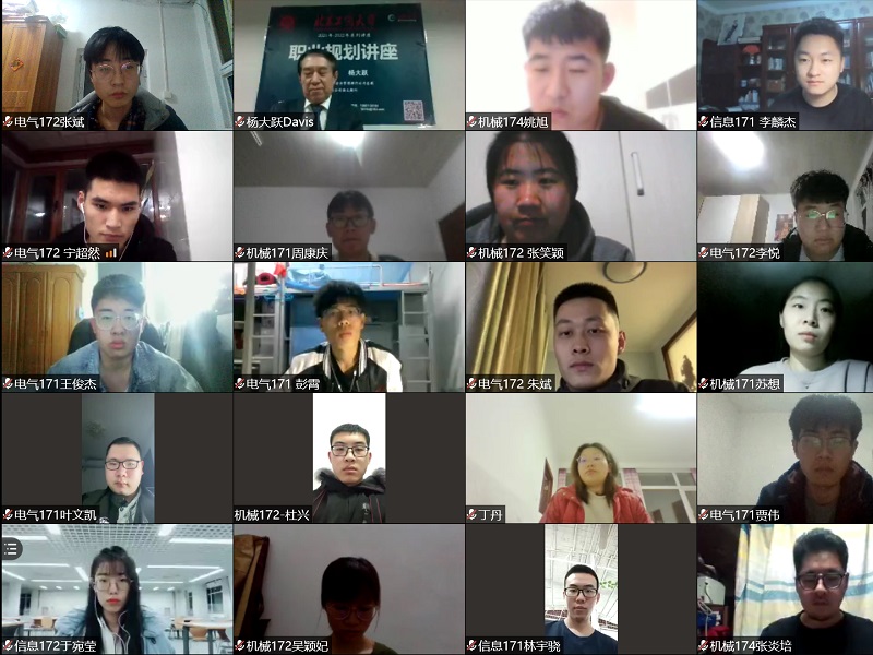 隨著就業市場競爭越來越激烈,職業生涯規劃越來越受到高校和大學生們的重視,為幫助同學們了解職業生涯規劃的重要性,人工智能學院邀請知名校友楊大躍作職業生涯規劃系列講座,3月16日和3月19日晚,楊大躍通過線上講座的方式,為人工智能學院的同學們作《邁向職業生涯成功的起點》初級和中級班講座。