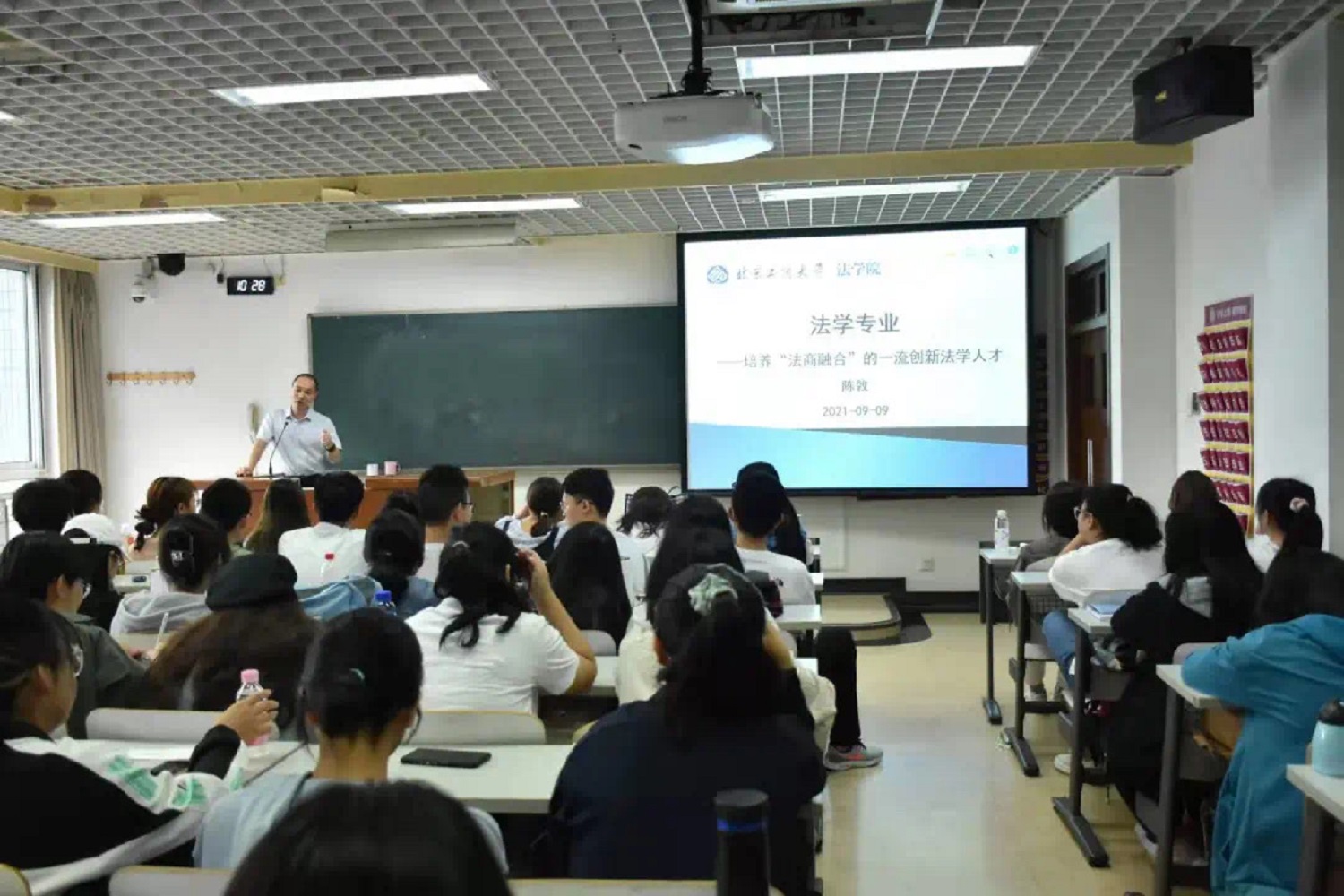 為培養(yǎng)“法商融合”的一流創(chuàng)新法學(xué)人才,幫助新生同學(xué)了解法學(xué)專業(yè)特點、明確學(xué)習(xí)方向,學(xué)院組織開展“走進專業(yè)”系列講座。首場講座特別邀請呂來明教授,圍繞如何成為一名自覺自信的法律人,深入淺出地講解了法律邏輯、法律價值,帶領(lǐng)大家走進法學(xué)專業(yè)。陳敦副院長以《培養(yǎng)“法商融合”的一流創(chuàng)新法學(xué)人才》為題詳細介紹了法學(xué)專業(yè)的發(fā)展歷程、專業(yè)榮譽、培養(yǎng)目標(biāo)及培養(yǎng)路徑等專業(yè)內(nèi)容。李晗副教授通過解讀司法考試,引領(lǐng)新生了解法學(xué)專業(yè)現(xiàn)狀,切實增強法學(xué)專業(yè)學(xué)生的職業(yè)競爭力。教師姚邢對于就業(yè)、升學(xué)、考研等熱點問題,提出了兼具針對性和實用性的建議,她建議同學(xué)們合理規(guī)劃時間,優(yōu)化學(xué)習(xí)方法。法學(xué)院通過全方位立體化的專業(yè)啟蒙教育,培養(yǎng)新生盡早建立法律思維,為法治中國建設(shè)貢獻青春力量。