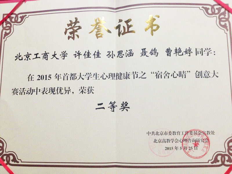 通過專家評(píng)議,英語(yǔ)132班8463宿舍獲得北京市心晴宿舍二等獎(jiǎng)。