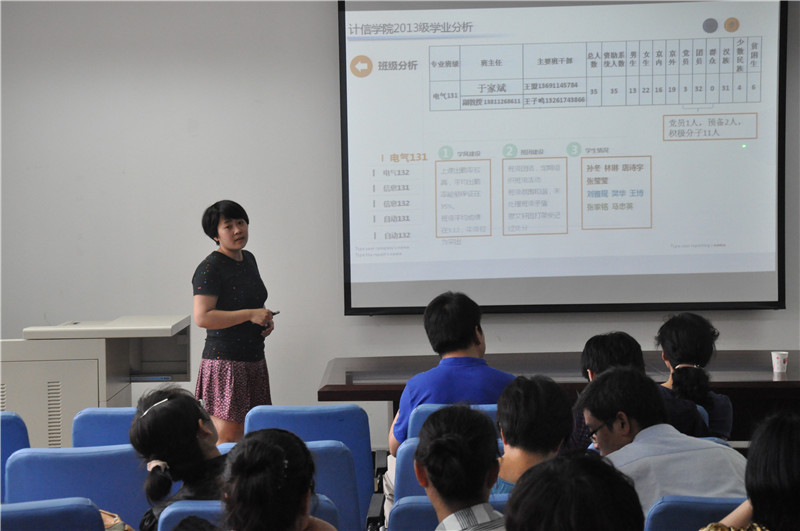 會(huì)上,各年級(jí)輔導(dǎo)員分別就年級(jí)總體學(xué)業(yè)情況、班級(jí)學(xué)業(yè)分析、各門(mén)課程分析、期末考試情況、班主任工作情況、學(xué)風(fēng)建設(shè)規(guī)劃等方面進(jìn)行了詳細(xì)匯報(bào)和說(shuō)明,數(shù)據(jù)詳實(shí),內(nèi)容豐富,并對(duì)年級(jí)、班級(jí)、學(xué)優(yōu)生、學(xué)困生等具體情況進(jìn)行了分析,提出了改進(jìn)建議。系主任、班主任認(rèn)真聽(tīng)取,并不時(shí)提問(wèn)和記錄,還與輔導(dǎo)員就本學(xué)期的各項(xiàng)工作進(jìn)行了討論。