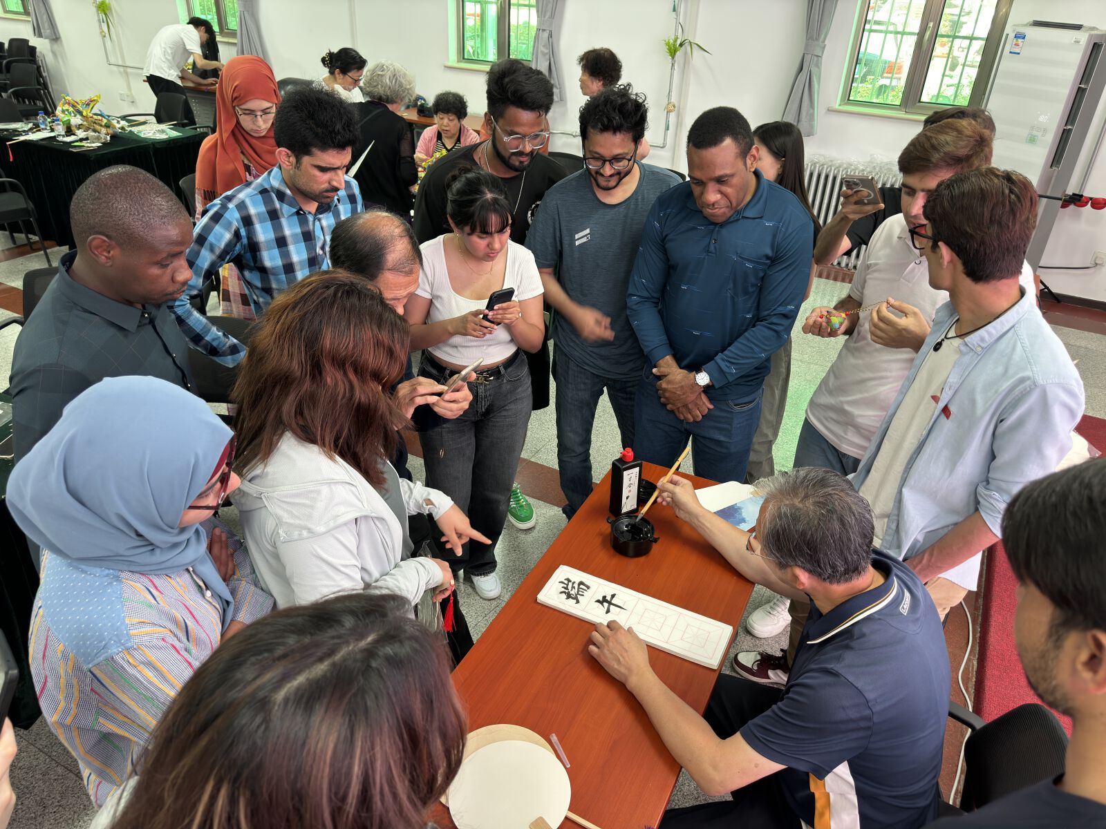 學校中文教研室退休教師夏京春副教授詳細介紹了端午節的歷史由來、傳統習俗和文化意義,讓大家對這一傳統節日有了更加深刻的了解。在手工制作香囊環節,退休老師耐心地指導留學生填充艾葉,縫制香囊。許多留學生表示,這是他們第一次親手制作香囊,感到非常新奇和興奮。在扇面上書寫毛筆字“端午安康”,這對留學生來說有些困難,但他們興趣盎然,不僅學習了中文,還感受到了中國書法的藝術美。活動的高潮是有獎問答環節,問題圍繞端午節的傳統習俗和歷史知識展開。現場氣氛活躍,老干部和留學生們積極參與,不少留學生憑借剛剛學到的知識獲得了小獎品,現場洋溢著歡聲笑語。