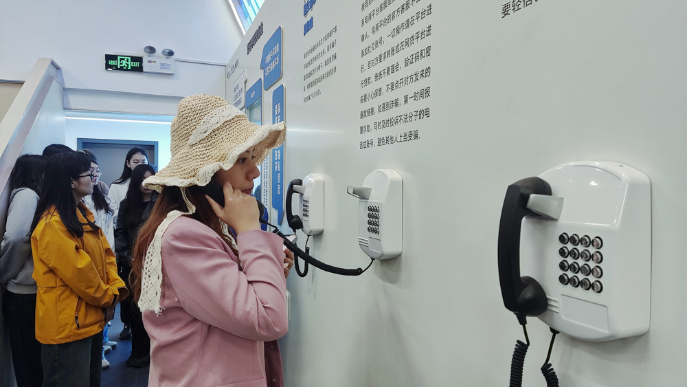 講解員介紹了現場裝置的詐騙語音集錦墻,同學們拿起電話,“客服退款”“中獎通知”等詐騙話術便在耳邊響起,真實模擬詐騙電話的接聽場景,創意的設計和沉浸式場景還原讓大家有身臨其境的感覺。