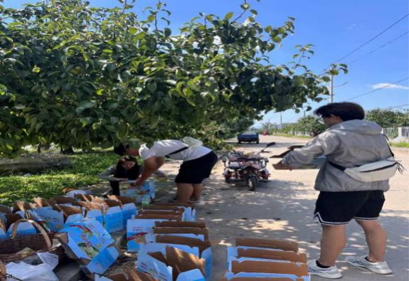線上,實踐團在抖音開展直播活動,打造爆火IP,吸引大批客流,不僅對賈河村京白梨進行了詳實的介紹,成功帶貨賣出了多單白梨,有效提升了村民的銷售收入,也在一定程度上提高了賈河村京白梨的網(wǎng)絡(luò)知名度,為果農(nóng)進行網(wǎng)絡(luò)銷售打開了局面、做好了鋪墊。與此同時,實踐團還通過微信等社交平臺進行快團團的銷售活動,這一形式為不便前來現(xiàn)場又向往白梨好味的廣大社會人士提供了極大的便利,取得了良好的效果。實踐團成員現(xiàn)場積極幫助果農(nóng)采摘、包裝、打包,并運送到快遞站寄出,活動當(dāng)天共為果農(nóng)售出梨565斤,3小時創(chuàng)收3109元。