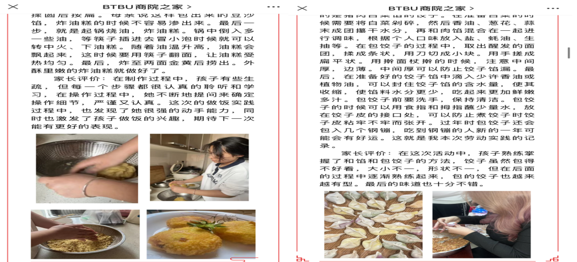 為了激發學生熱愛勞動的內生動力,引導學生學會勞動、樂于勞動,掌握必備的勞動技能,形成尊重勞動,勞動光榮的新風向,學院在1月13日至2月15日開展“喜慶二十大,勞動不斷線”寒假勞動教育實踐活動,主題為“在勞動中成長淬煉”。同學們自己動手做的家鄉菜讓人垂涎欲滴;大掃除后的房間一塵不染;垃圾分類井井有條;家庭防疫一絲不茍;傳統文化相關的作品也精美絕倫,受到了同學們的一致好評。截止活動報名結束,共有近40余人參與本次活動,勞動內容豐富多彩,如“學做一道就家鄉菜”中同學們各顯奇招,制作各自家鄉的傳統美食炸油糕、包餃子、糖醋里脊、皮蛋豆腐等等美食佳肴。同學們上傳了自己認真勞動的照片,同時也感悟到勞動使人幸福。當一個人專注于自己的勞動時,思維是敏銳的,心靈是充實的,精神是愉悅的,可以說,作為一名勞動者,就是一個幸福的人!