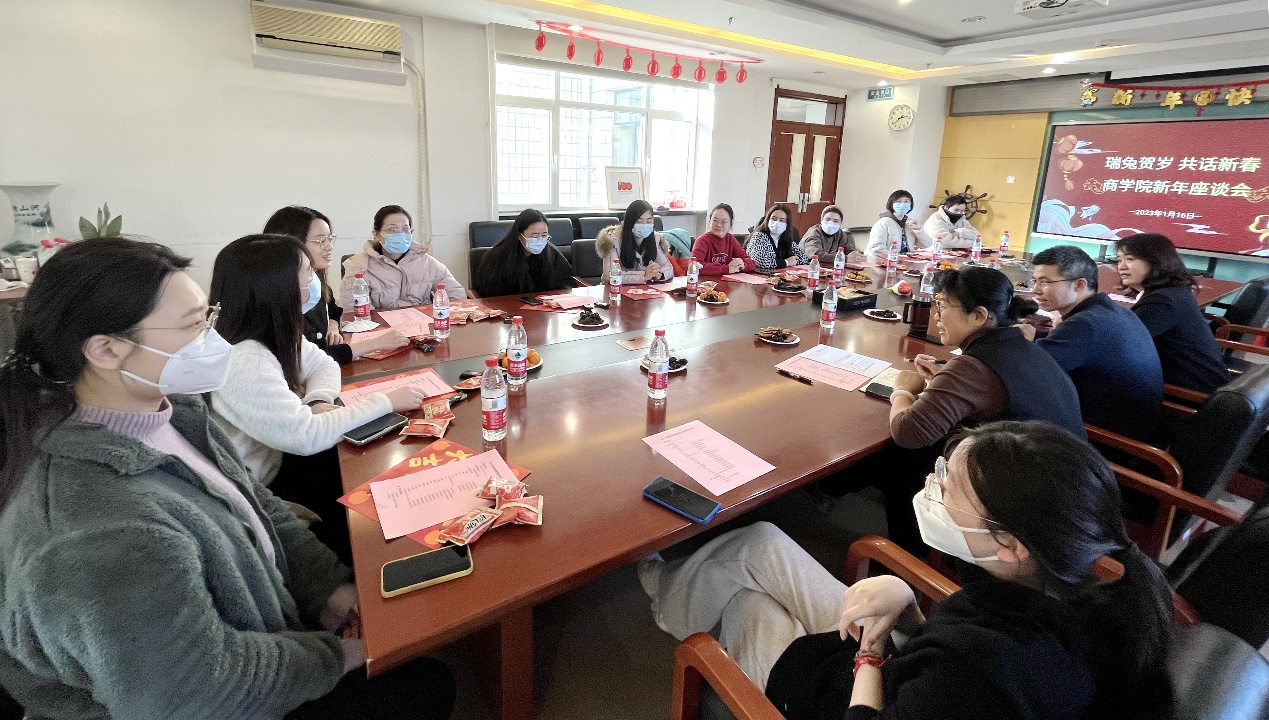 共話新春、共享祝福,獻計發展、共促成長。1月16日下午,商學院組織寒假留校過節學生舉行“瑞兔賀歲 共話新春”迎新春座談會。學院黨委書記張春萍、學校研究生院院長兼商學院院長毛新述、學院黨委副書記張倩、輔導員馬珂、張欣宇及12名留校過節本、碩、博學生參加座談會。會議由學院黨委副書記張倩主持。