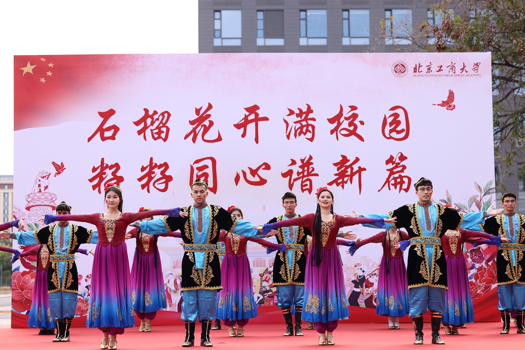 活動分為文藝匯演及民族特色文化展覽體驗兩個環節。文藝匯演由全校34個民族80余名同學以歌曲、舞蹈、民樂、朗誦、T臺秀等形式展示風采。開場民樂合奏《龍船》,引領同學們回顧祖國75年來的風雨兼程與輝煌成就。漢服社舞蹈《千年一夢》優雅的身姿與莊重的禮儀彰顯中華文化的博大精深。維吾爾族、藏族同學舞蹈表演《石榴花開》、《尕瓦亞珠》演繹出石榴花從含苞待放到盛開的過程,寓意著各民族團結一心,共同書寫新的篇章。身著色彩鮮艷的傳統服飾《多彩民族風尚秀》T臺秀,每一步都踏出文化的韻律。最后現場所有師生合唱《歌唱祖國》,深情唱響對祖國的無比熱愛,祝福偉大祖國繁榮昌盛。