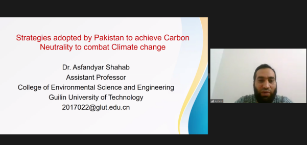桂林理工大學Asfandyar Shahab助理教授作了題為“巴基斯坦為實現碳中和、應對氣候變化所采取的策略”的報告。他詳細介紹了巴基斯坦面臨的氣候變化問題和碳排放現狀,列舉了其在生態、能源結構、政策、科技等方面的舉措。