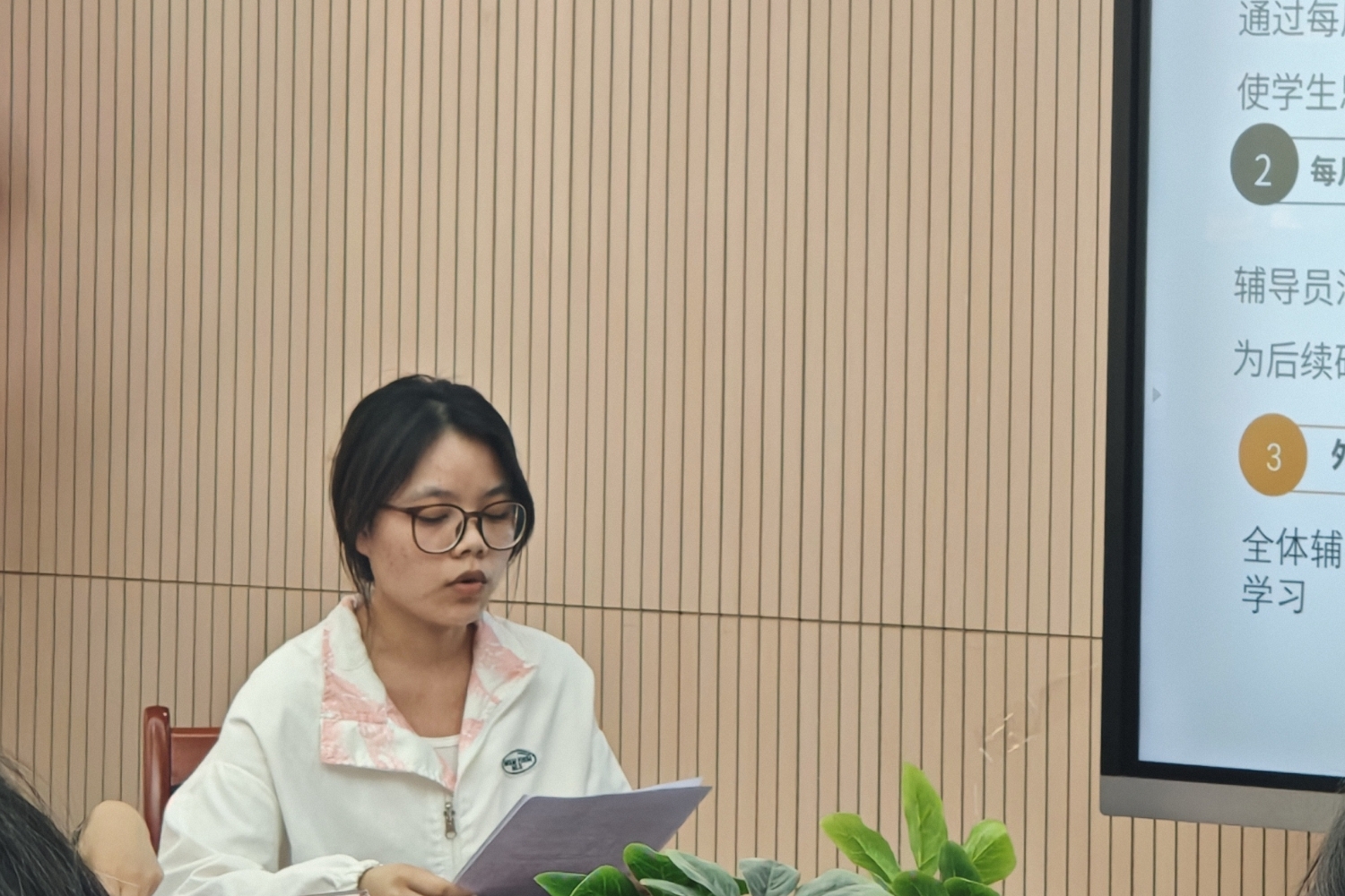 學院黨委副書記畢平平在匯報中講到,圍繞學校構建“本業為主-主動工作-以學生為中心”學生工作體系,學院堅持以學生需求為中心,積極探索提升輔導員思政引領力工作模式,形成涵蓋理論學習、隊伍建設、服務需求、五育并舉、網絡思政等五方面的能力提升行動方案。她重點講述00后學生的變化與輔導員工作能力的矛盾,隨后她就學院在提升輔導員思政引領力方面的具體探索進行介紹,包括集體學習、協同育人、“學生議事廳”、二級心理輔導站以及學生活動“三大團”,學院精品宣傳等工作亮點。