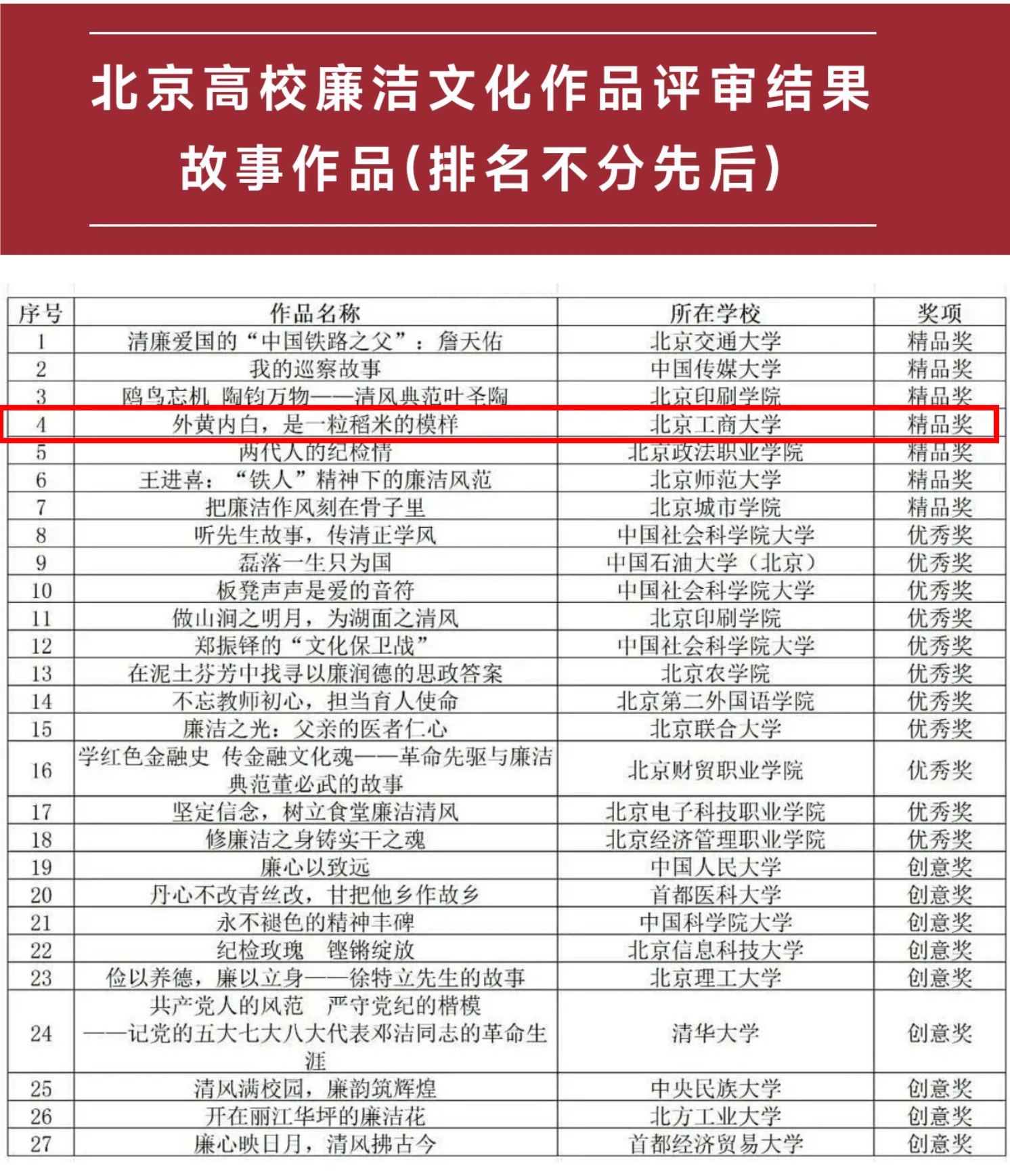 近日,北京市思想政治中心公布了北京高校廉潔文化作品的獲獎名單,我校計算機與人工智能學院步承澤的《外黃內白,是一粒稻米的模樣》獲故事作品精品獎,法學院郝琳琳、黎軒松的《持廉守正 兩袖清風》獲創意作品優秀獎。