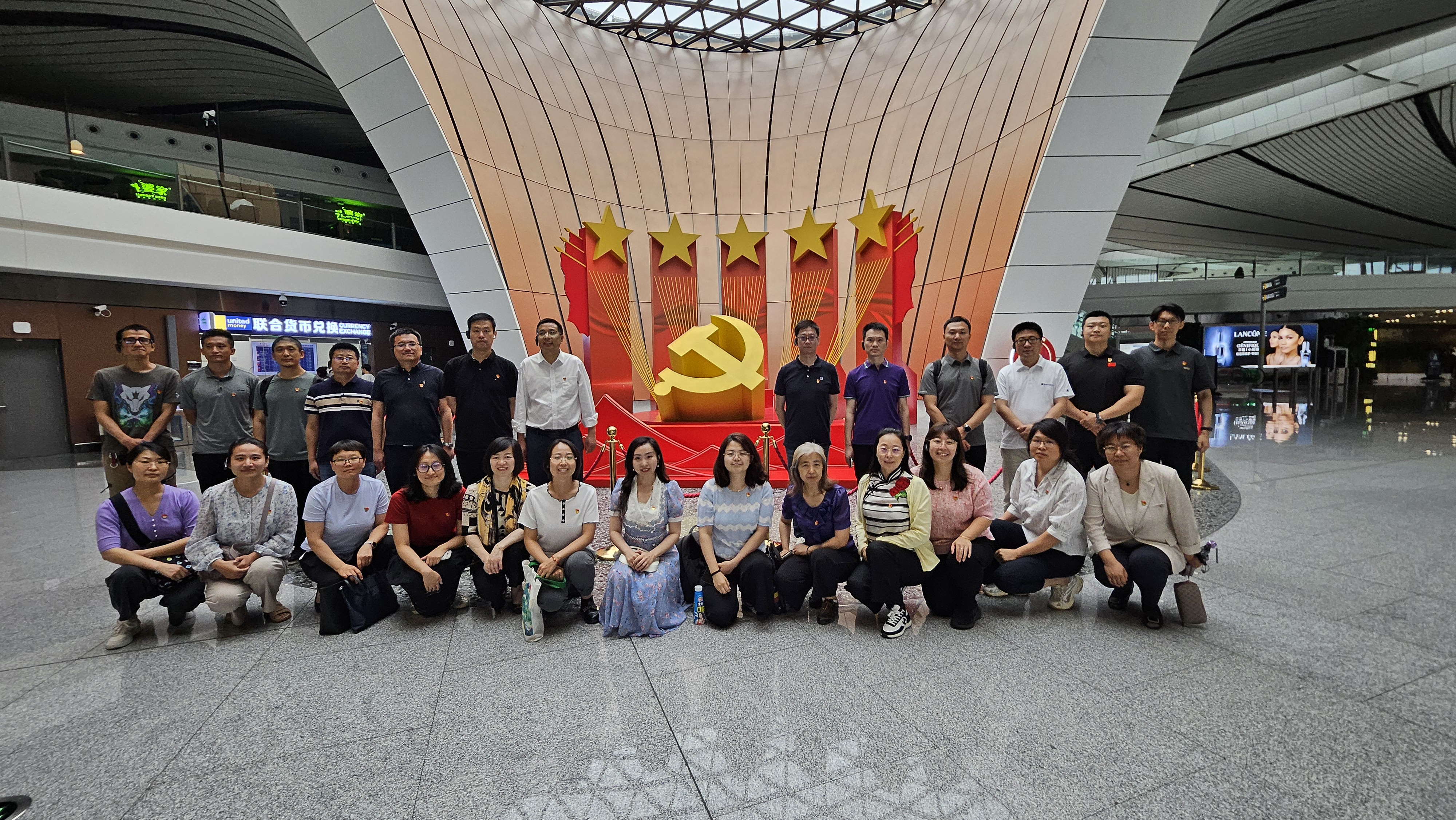通過(guò)參觀走訪,每一名參加活動(dòng)的黨員切實(shí)感受到了中國(guó)智慧和中國(guó)力量。大型儀器設(shè)備共享中心黨員王晨萌談到,近半年幾次在大興國(guó)際機(jī)場(chǎng)出行,航站樓采用五指廊構(gòu)型,雙層出發(fā)設(shè)計(jì),從航站樓中心到最遠(yuǎn)端登機(jī)口步行時(shí)間不超過(guò)8分鐘,為全球首創(chuàng),比傳統(tǒng)方式提高四倍,讓旅客充分感受到了高質(zhì)高效的服務(wù)。機(jī)場(chǎng)內(nèi)充滿文化底蘊(yùn)和設(shè)計(jì)感的景觀以及隨處可見(jiàn)的“黑科技”等,都是大國(guó)工匠的卓越智慧與創(chuàng)新精神的完美融合。科學(xué)研究院黨員趙浩講到,大興國(guó)際機(jī)場(chǎng)的現(xiàn)代化設(shè)施和人性化設(shè)計(jì)生動(dòng)展現(xiàn)了祖國(guó)科技的飛速發(fā)展、基礎(chǔ)設(shè)施建設(shè)的雄厚實(shí)力及智慧化出行的便捷與高效,通過(guò)實(shí)地參觀深刻感受到了習(xí)近平新時(shí)代中國(guó)特色社會(huì)主義思想在京華大地的生動(dòng)實(shí)踐,是一個(gè)生動(dòng)的愛(ài)國(guó)主義紅色課堂。最后,同行黨員們?cè)诤秸緲撬膶咏逃卣故緟^(qū)進(jìn)行了集體合影,喊出了“祖國(guó)強(qiáng)大 民族復(fù)興”的口號(hào)。
