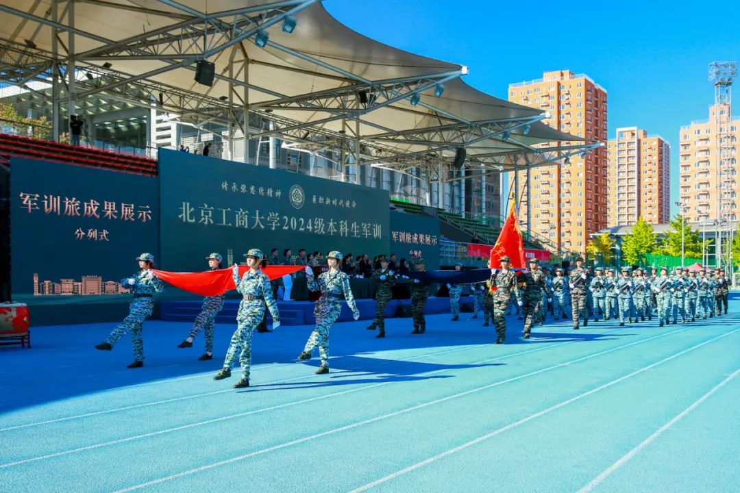 19個連隊分列式方陣邁著矯健的步伐依次走過主席臺。他們步伐堅定、口號鏗鏘,展現北工商2024級學子的青春風采。