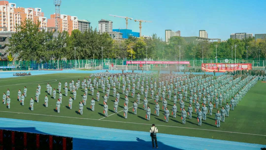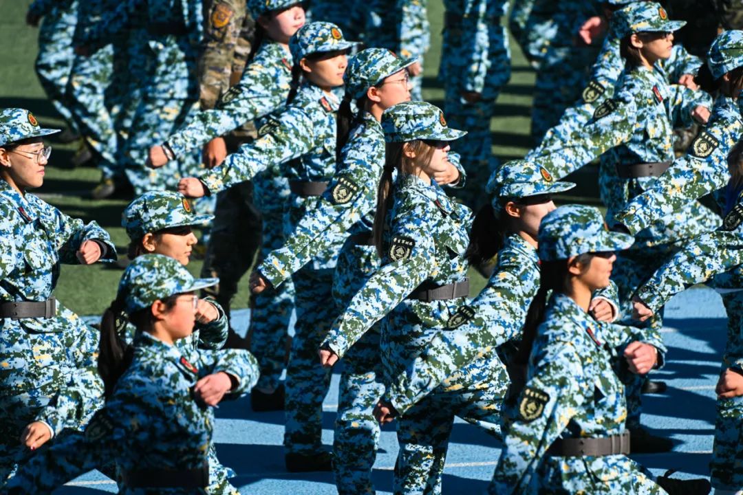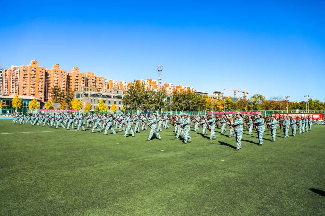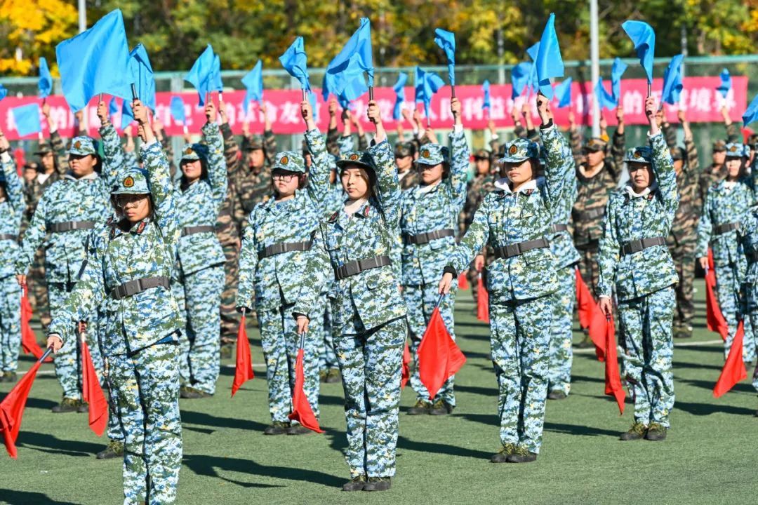 莊嚴列隊、英姿颯爽,國旗、校旗、軍訓旅旗在旗手和護旗兵前迎風飄揚、熠熠生輝。