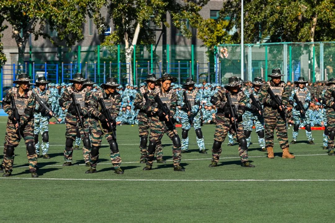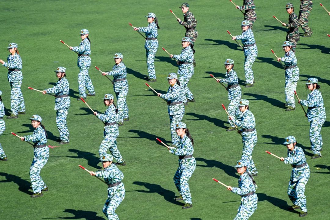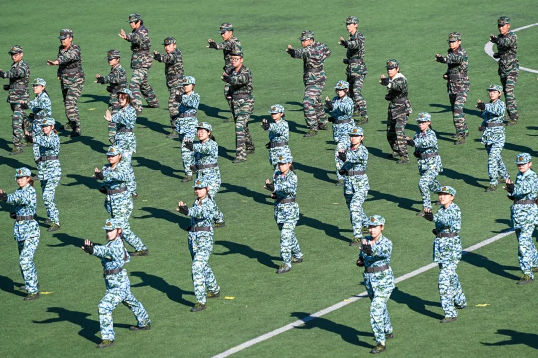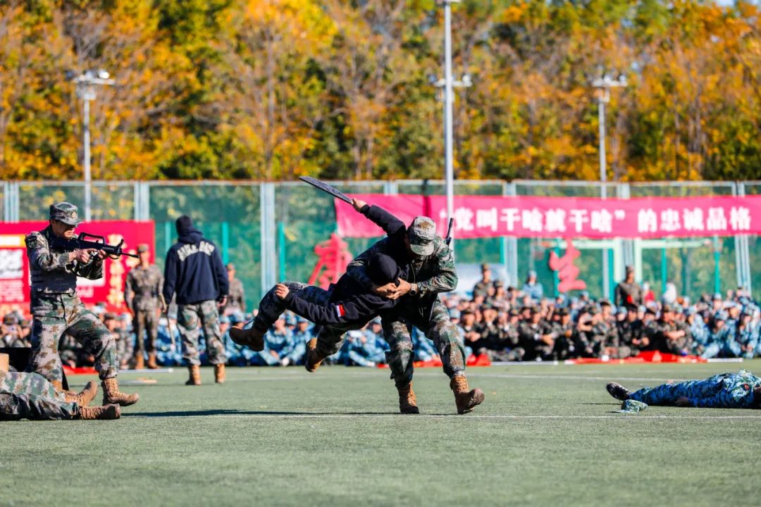 在軍訓成果展示中,同學們分別進行了分列式和特色科目展示,特色科目包含:應急棍、擒敵拳、匕首操、刺殺操、旗語、戰術等。