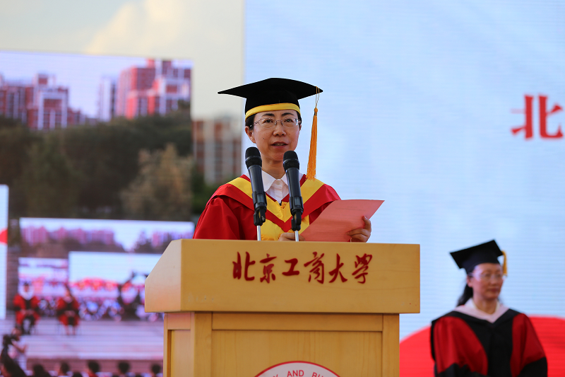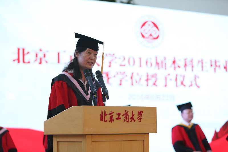 副校長李朝鮮宣讀了《北京工商大學關于2016屆本科生畢業及學士學位授予的決定》,黨委副書記董竹娟宣讀了《北京工商大學關于表彰2016屆優秀本科畢業生的決定》。今年,我校共有2743名本科生完成全部課程,總計授予2653名本科生學士學位,授予118名本科畢業生“北京工商大學優秀畢業生”榮譽稱號,另有135名本科畢業生榮獲“北京市優秀畢業生”。