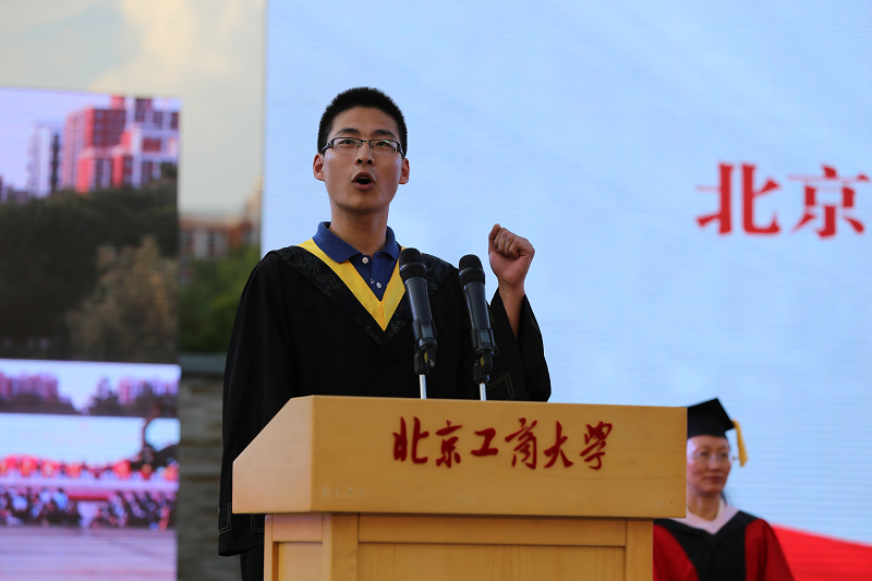 材料與機械工程學院陳鋒作為2016屆本科畢業生代表發言,回憶了“從良鄉到阜成路,從文二樓到教三樓”的美好時光,表達了對老師、家長和同學們的感謝,及對母校的不舍,并代表所有畢業生為母校送上深深的祝福,表示將帶著堅韌與自信,攻堅克難,追求卓越,成為母校的驕傲。