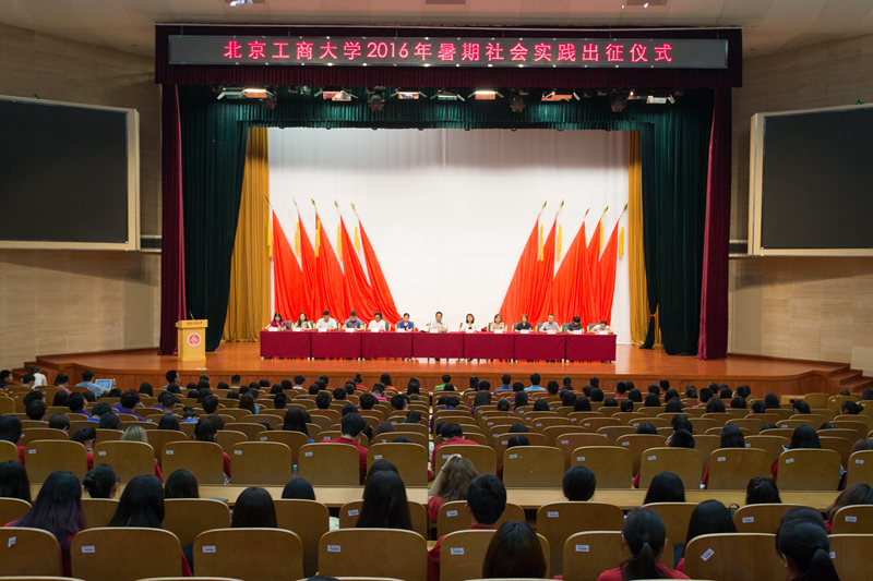 在國歌聲中,出征儀式拉開帷幕。團委書記王海偉介紹了我校2016年暑期社會實踐基本情況。今年我校開展以青年服務國家——投身助力十三五,青春奮進中國夢為主題,以理論學習、政策宣講、基層建設、走訪調研、志愿服務為主要形式的暑期社會實踐。本次實踐分為集中實踐和分散實踐。集中實踐包括十鄉百村千人行暑期社會實踐團、房山區暑期高校大學生社會實踐團、社區青年匯新青年學堂成人高考培訓實踐團、思想教育主題實踐團、暑期大學生志愿服務實踐團,赴英國牛津大學學生培訓實踐團以及服務騰沖暑期聯合社會實踐團等七個團隊。其中青年志愿者協會敬老愛老志愿服務團和服務騰沖暑期聯合社會實踐團還入選了北京市暑期社會實踐百強團隊。王海偉表示今年是十三五規劃的開局之年,希望將社會實踐打造成第二課堂的育人品牌,引導幫助更多學生在實踐中成長。