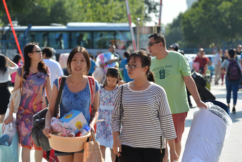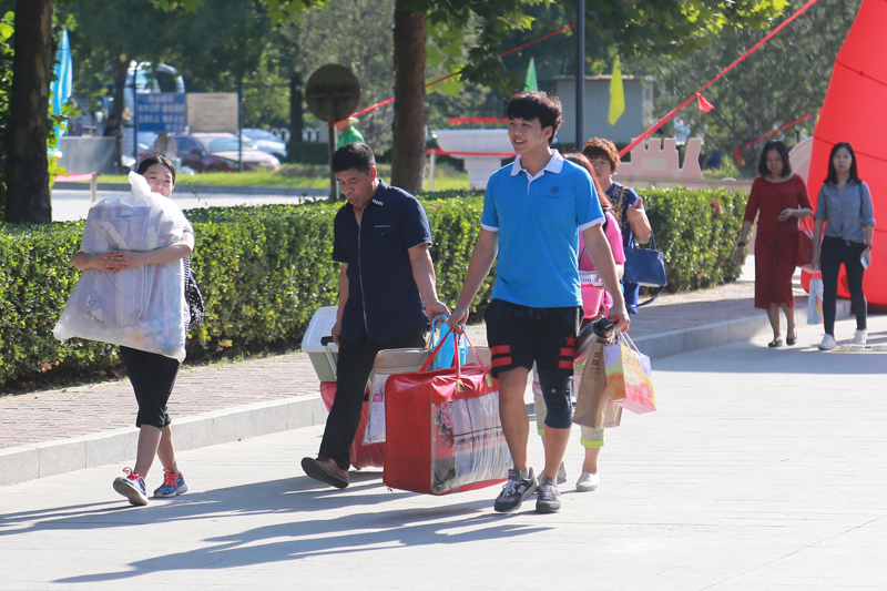 在迎新現場我們還看到了很多班主任,由教授擔任班主任在我校已是第二年實施。他們中不僅有資深的學術專家,也有年輕有力的青年骨干。其中不少老師已多年擔任班主任工作,具有豐富的經驗。今天,他們也一早來到現場,了解學生報到情況,與學生親切交流,并深入了宿舍,了解學生住宿情況。