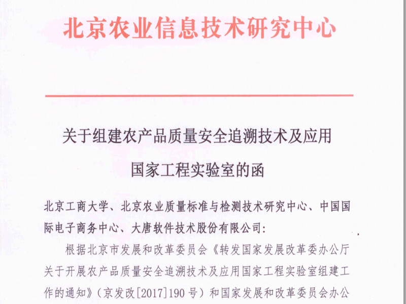 2月24日,國家發(fā)展和改革委員會、北京市發(fā)展和改革委員會先后下達《關于開展農產品質量安全追溯技術及應用國家工程實驗室的通知》,我校與北京農業(yè)信息技術研究中心等4家機構聯(lián)合申報的“農產品質量安全追溯技術及應用國家工程實驗室”正式獲批。這是我校首次獲批國家級重點實驗室。
