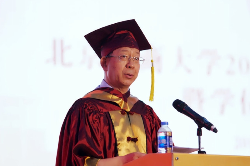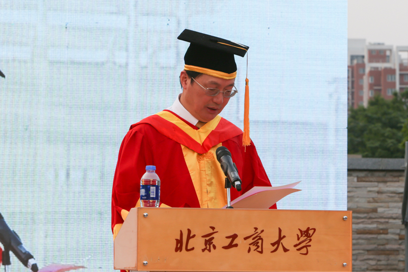 校長孫寶國院士在發言中代表學校黨政向2017屆畢業生表示熱烈的祝賀,向為同學們成長而辛勤耕耘的全體教職員工表示衷心的感謝,向前來參加畢業典禮的各位家長和朋友們表示誠摯的歡迎。孫校長談到,2017屆本科畢業生是北工商歷史上國際化基礎最好、能力最高的一屆,是北工商一流大學征程中具有里程碑意義的一屆,第一次突破了學校本科人才培養質量“369”標志性指標中 “6” 的指標;今年考研和出國深造的學生數是學校歷屆畢業生中最高的。畢業生中有28人次獲得國家獎學金,625人次在各類競賽中獲得市級以上榮譽,93人次獲得“校園之星”的榮譽稱號,24人被評為“北京市三好學生”,138人被評為“北京市優秀畢業生”,32名同學投筆從戎。孫校長希望同學們要有“生當為人杰”的志向,努力學習和工作;同時要懷感恩之心,在工作和生活中懂得回報,懂得禮讓,學會謙讓,做到忍讓。孫校長談到,國家給年青人搭建了廣闊的舞臺,希望大家勇挑重擔,施展才華,勇敢追夢。最后,孫校長以一首包含北工商校訓的詩寄語畢業生“三千學子踏征程,工商校訓伴君行,求真立德修心性,勤奮創新建奇功”,希望2017屆學子在新的崗位奮發向上,建功立業,創造新的輝煌,成為北工商的驕傲!
