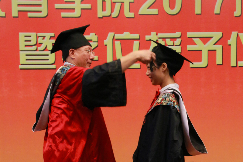 在歡快的音樂聲中,學(xué)位授予儀式正式開始。謝志華副校長為學(xué)士學(xué)位獲得者扶正流蘇,頒發(fā)學(xué)士學(xué)位證書,并對他們?nèi)〉玫某煽儽硎咀YR。