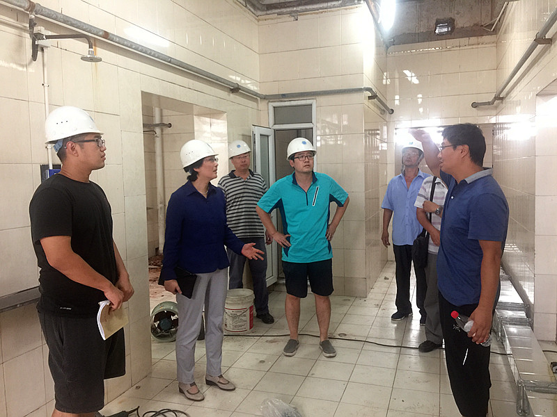 在施工工地現(xiàn)場,張耘副校長聽取了有關(guān)項目改造內(nèi)容、施工組織設(shè)計、安全生產(chǎn)管理、進度計劃等情況的匯報,就發(fā)現(xiàn)的一些問題提出意見和工作要求,并向保障我校暑期改造項目安全順利運行的設(shè)計、監(jiān)理、施工單位和一線工人表達親切的慰問。了解到在改造工程施工期間,后勤基建處要求各方配合采用科學(xué)手段進行流水作業(yè)及交叉施工,克服主材加工訂貨周期長及各專業(yè)工程工序工期不可壓縮的困難,努力做好應(yīng)對連續(xù)多次強降雨的安全防護措施。為確保改造后短時間達到教學(xué)科研的使用條件,建筑內(nèi)墻涂料均采用環(huán)保型無醛水性涂料;在公用區(qū)域及部分功能房間采用新型LED節(jié)能光源,讓建筑做到了“低能耗、高照度”;對兩棟以教學(xué)科研為功能體現(xiàn)的建筑進行水電改造,建造“樹形”增容系統(tǒng),為今后教學(xué)科研設(shè)備的添置和使用提供條件保障。
