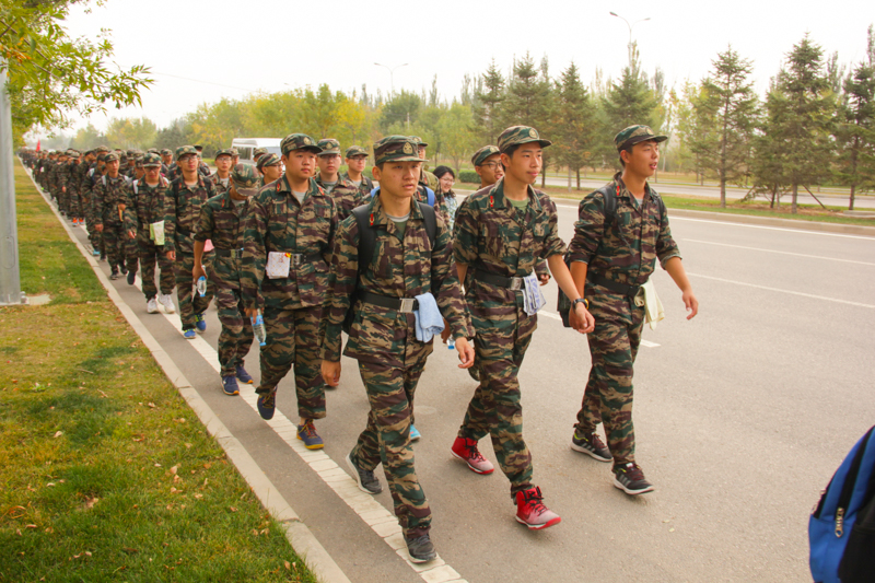 越野拉練是軍訓的重要科目,25日一早,在鮮紅的團旗帶領下,軍訓團開始了8公里的徒步急行軍。前后近3個小時的行軍途中,16個連隊一路高歌,教官和指揮部領導老師、帶隊輔導員全程陪伴,中途還進行了防空襲、通過染毒地帶的科目演練。