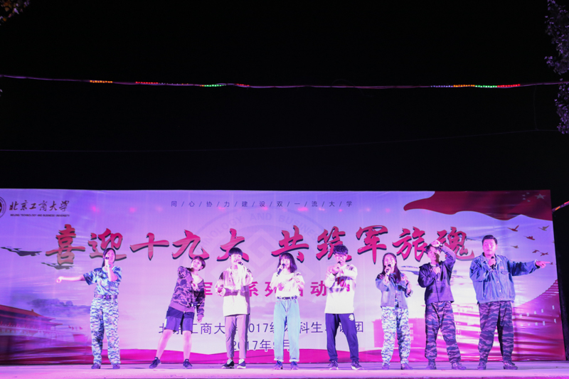 軍訓育人不拘訓練場。2017級軍訓期間,訓練中學生一天都沒有休息。為了鼓舞士氣,在火熱的訓練之余,以“喜迎十九大 共筑軍旅魂”為主題的各類活動也有序展開。通過活動,一方面勞逸結合,張弛有度,使參訓學生體力得以調整;另一方面,對學生開展愛國主義、集體觀念等教育。