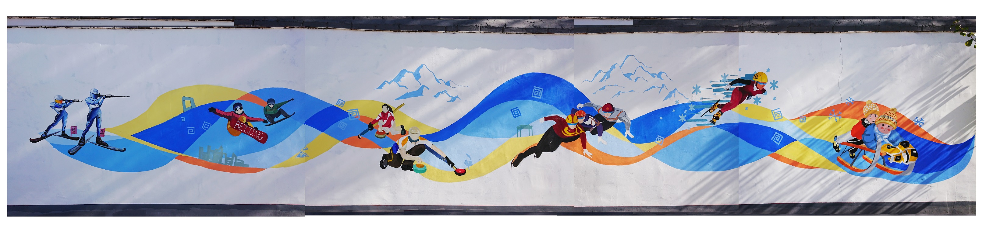 10月29日,墻繪作品進入裝飾、收尾階段,下午13時,延慶冬奧墻繪活動圓滿完成。此次墻繪底紋部分以北京著名建筑物為主,并以雪山、雪花、中國傳統(tǒng)圖形作空間裝飾,圍繞墻繪作品、主題圖及彩帶進行添加,為原本就已經很精美的畫作更添加了一抹生動和立體感。