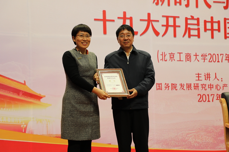 講座結束之后,學生處呂素香處長代表北京市委教育工委為楊建龍教授頒發了“首都高校百位名家共講十九大”的聘書,并合影留念。