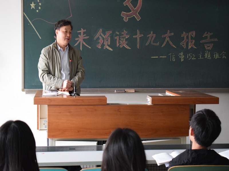 班會最后,方德英副校長以微黨課的形式與大家分享他自己學(xué)習(xí)十九大報告的感想。“我們是相像的,因為我和同學(xué)們學(xué)習(xí)的是相同的專業(yè),只不過我比同學(xué)們早了30年而已”。親切而幽默的話語一下子活躍了課堂的氛圍,他表示,能來信管152班的班會傾聽同學(xué)們對于十九大精神的理解是一件很幸運的事情,“感覺同學(xué)們對十九大的理解還是比較深刻的,同學(xué)們從家鄉(xiāng)人民生活的變化、國際國內(nèi)形勢、影視作品、旅游見聞等大學(xué)生視角,對十九大從不同方面進行了解讀,談出了自己的見解,更進一步堅定了理想信念,這種形式非常好,班會時間有限,發(fā)言的同學(xué)還不是很多,以后這種形式的班會可以經(jīng)常組織”。他還指出,黨的十九大是一次開啟新時代的大會,做出了“兩個一百年”的戰(zhàn)略部署,它既總結(jié)了中國過去的發(fā)展歷程,又規(guī)劃了中國未來的發(fā)展方向,到建國100年時,我們要建成社會主義現(xiàn)代化強國,在學(xué)習(xí)過程中大家都非常憧憬那個時代的強大祖國和美好生活,但是,這不是敲鑼打鼓就能實現(xiàn)的,我們學(xué)習(xí)十九大精神,最后的落腳點是要落實到行動上。希望同學(xué)們認(rèn)真貫徹落實十九大精神,能在最美的年華,努力學(xué)習(xí),加強自律,不辜負(fù)這美好的時光,在這嶄新的時代綻放出最耀眼的光芒!