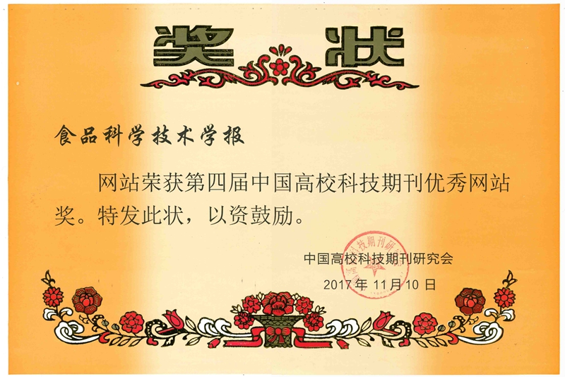 “中國高校科技期刊優秀網站”的評選每兩年開展一次,評選所用的評價指標體系包括基本功能、擴展功能、多媒體融合等3項一級指標和35項二級指標。此次在全國范圍內共評選出62家優秀網站。《食品科學技術學報》網站是連續三屆獲此榮譽。