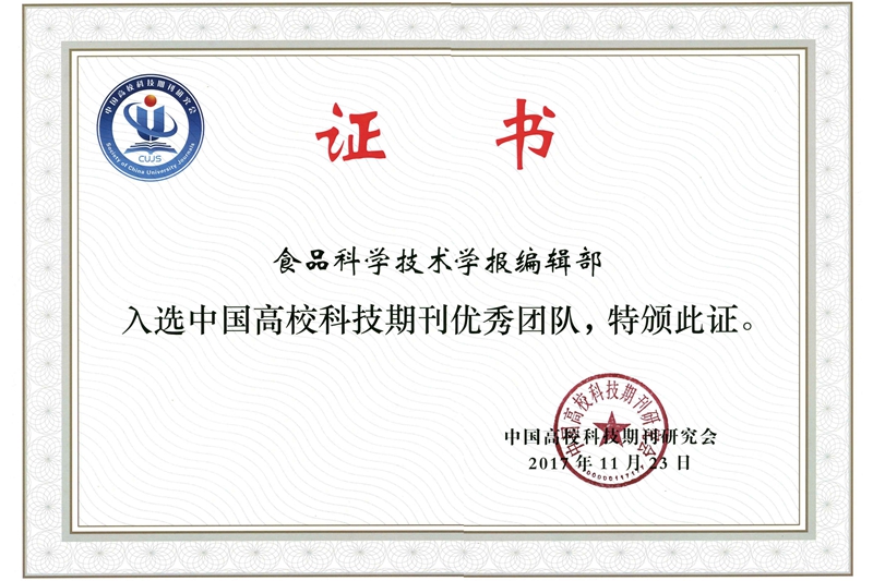 11月23日,在中國高校科技期刊研究會第21次年會暨30周年紀念會上,我校《食品科學技術學報》編輯部獲評“中國高校科技期刊優秀團隊”,《食品科學技術學報》網站獲評“第四屆中國高校科技期刊優秀網站”,編輯部李寧博士獲中國高校科技期刊“優秀編輯”稱號。