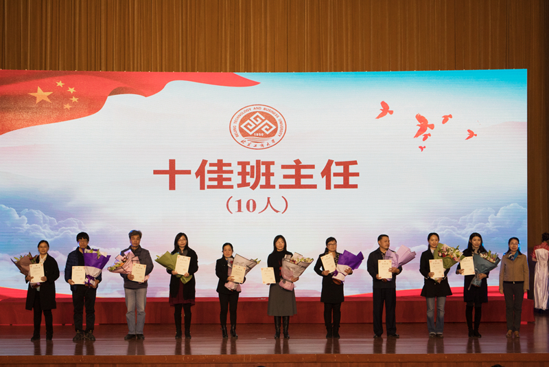 在對學生表彰的同時,學校對本年度評選出的關愛學生、無私付出的十佳班主任予以表彰。他們中,既有肩負教學科研重任,依然投身班主任工作的教授、副教授,也有利用業余時間指導班內學生廣泛參與各類競賽屢有斬獲的優秀導師;既有深入學生班級與每一位學生談心談話,對學生體貼關懷的資深班主任,也有善于利用新媒體手段貼近學生思想、深受學生愛戴的年輕班主任。十佳班主任在接受表彰的同時,與在座師生分享了作為班主任的體會和經驗,并接受了同學們獻上的鮮花。