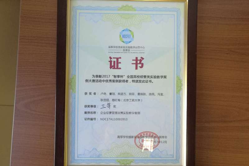 本次大賽收到來自廈門大學、武漢大學、南京大學、山東大學、中央財經大學、上海財經大學、對外經濟貿易大學等39所高校的72個案例,共有32個案例、近160名參賽選手及觀賽代表參加了總決賽。盧奇教授團隊的《企業經營管理決策實驗教學案例設計與應用》案例歷經網絡匿名評審、網絡人氣投票、決賽現場答辯等環節,最終從競爭激烈的管理組20個入圍決賽案例中脫穎而出,位居第四。這是盧奇團隊本學期獲得的第2個實驗教學大賽獎項。現場賽邀請了國內外十余位在案例教學、實踐教學方面有著豐富經驗的專家擔任評委,專家們的提問與點評讓參賽選手受益匪淺。