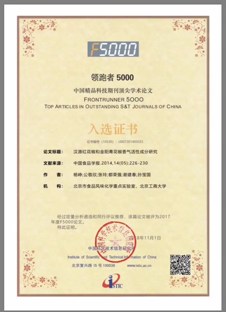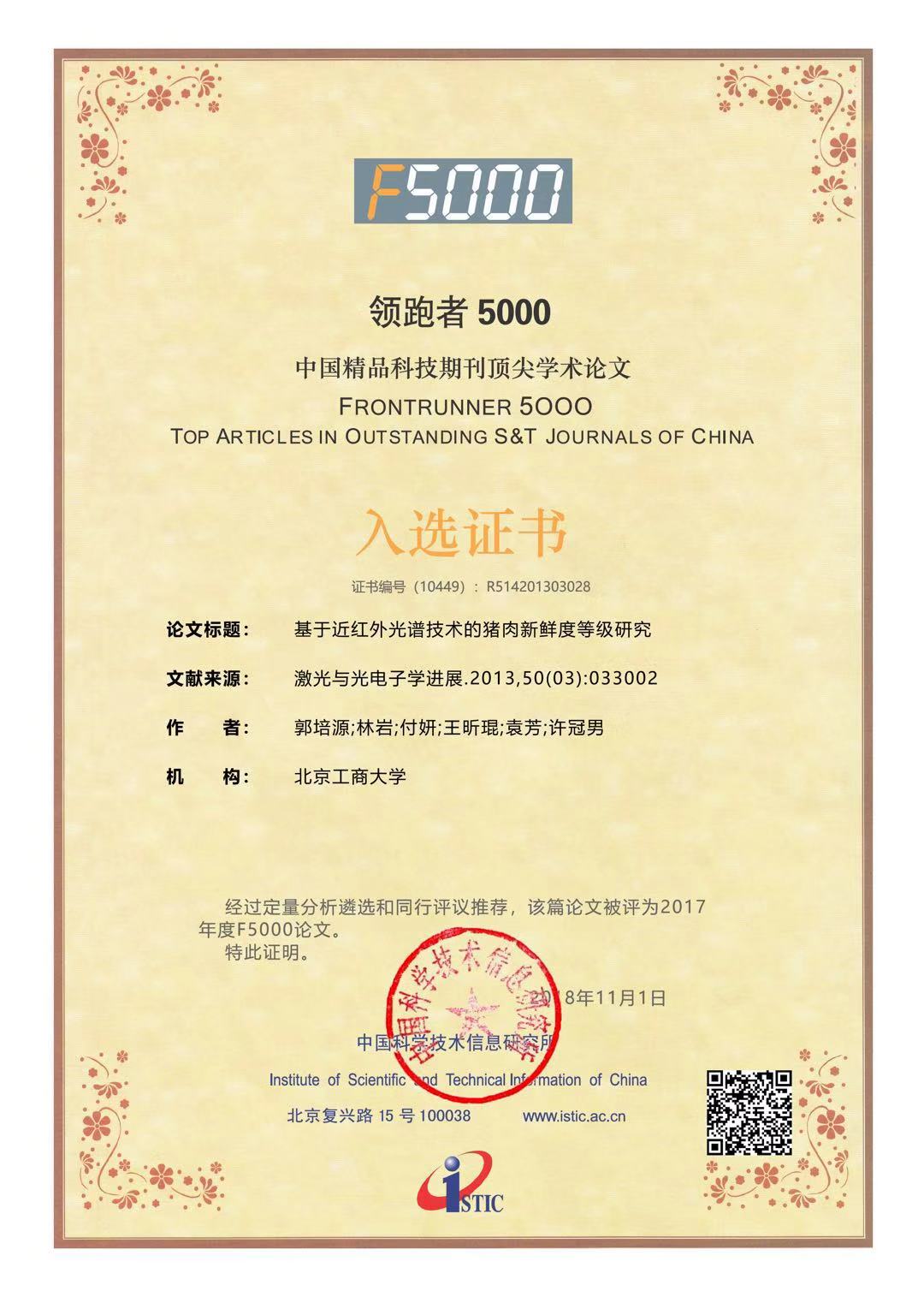 近日,在中國科學技術(shù)信息研究所發(fā)布的“領(lǐng)跑者5000(F5000)——中國精品科技期刊頂尖學術(shù)論文”名錄中,我校計算機信息與工程學院郭培源教授作為第一作者于2013年發(fā)表的《基于近紅外光譜技術(shù)的豬肉新鮮度等級研究》、我校食品學院謝建春教授、孫寶國院士于2014年發(fā)表的《漢源紅花椒和金陽青花椒香氣活性成分研究》論文獲得入選。這是我校再度入選F5000的論文。