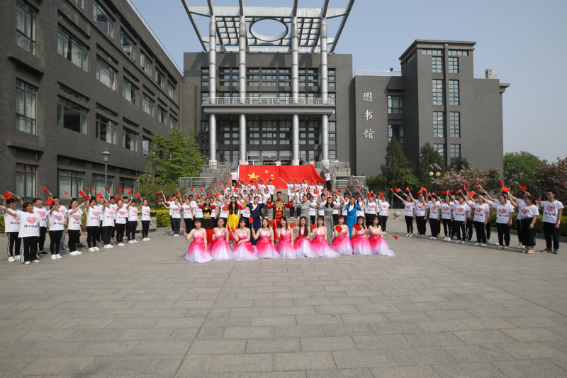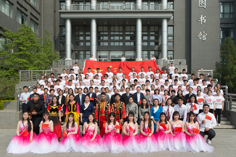 啟動儀式后,小提琴獨奏聲悠揚響起,近千名師生齊聚圖書館前,齊唱《我和我的祖國》。巨幅五星紅旗飄揚在圖書館的上方,學生們用嘹亮的歌聲、動人的舞姿,向新中國70華誕獻禮,美麗的音符和歌聲在春天的校園里緩緩流淌,少數(shù)民族學生別具特色的舞蹈將現(xiàn)場推向高潮。
