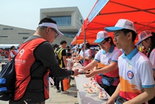 早上6點鐘,所有志愿者到位,在指定點位站定,集結方陣、分阻人流,維持會場秩序。上午8點半,長走大會正式啟動。8名旗手志愿者帶領參與者們有序向前行進;負責方陣集結的志愿者們,伴隨著激昂的口令聲,帶領“愛國先鋒”方陣大步向前走去。沿途,志愿者們站成兩列,一起搖動著手中的紅旗,為參與者們加油助威。在終點認證處,志愿者們在烈日下累計運送米袋130包、往返14次。認證志愿者們耐心引導所有長走參與者進入終點認證區,做好最后的認證工作,認真地為參與者們兌換紀念品。盡管烈日當頭,但志愿者們始終保持著良好的精神狀態,全身心投入到志愿服務中,以得體的舉止、甜美的微笑、優質的服務得到了工作人員與參與者們的一致認可。