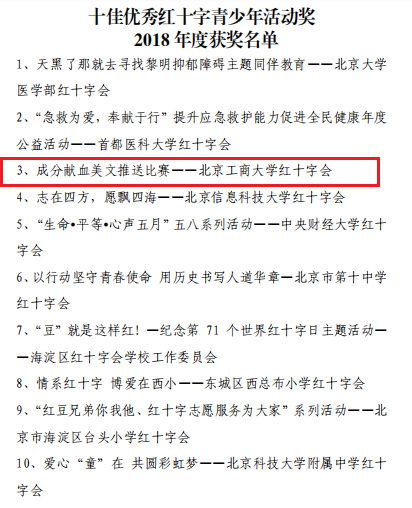 日前,北京市紅十字會組織了全市紅十字青少年活動評選,來自全市各紅十字會推薦的121個項目參與評選。經(jīng)過兩輪評審,我校申報的《成分獻(xiàn)血美文推送比賽》獲評“十佳優(yōu)秀紅十字青少年活動”,成為獲得該獎項5所高校之一。我校紅十字會學(xué)生分會會長史磊同學(xué)榮獲“優(yōu)秀紅十字青少年會員”稱號。
