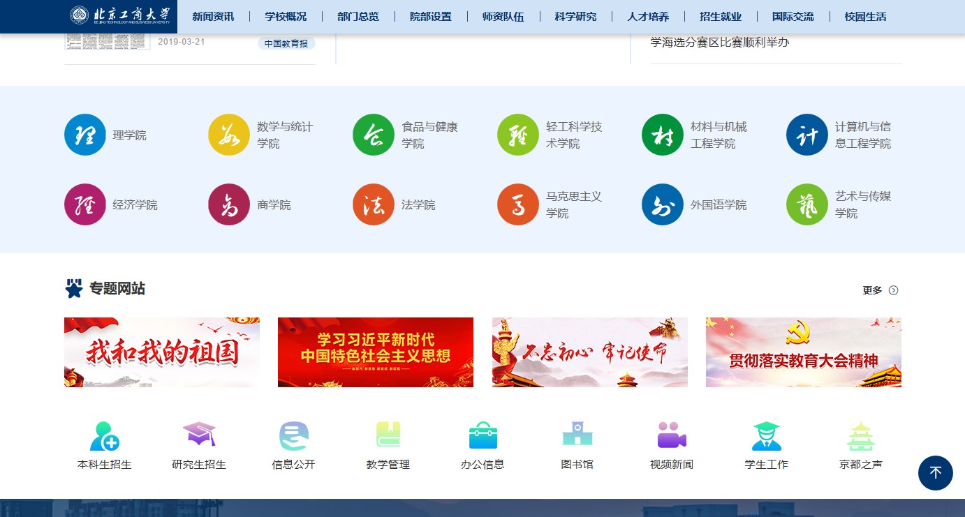 改版前對原版校園網進行了梳理分析,調研、參考了80多家國內外高校校園網的版面設計、欄目設置和頁面內容,進一步明確了校園網的功能、定位。新版校園網立足對外展示形象、對內服務師生,力求通過改版,以達到使用更便捷、架構更清晰、頁面更時尚的改版目標,進一步服務學校中心工作和師生需求。新版主頁以工商藍為主色調,采用寬幅版式,構圖具有鮮明的視覺沖擊效果。新版網頁主要變化有:第一,更新主頁面的結構,采用扁平化首頁高清主題圖片滾動展示重要節點、學校重要新聞事件、校園風景等內容,增加“工商印象”版塊,用大篇幅圖片展現學校優美風景,提升首頁整體美觀度,同時,將頁面增加至5.5屏,增加了信息的顯示量。第二,優化欄目設置與欄目顯示。為增強新聞可讀性,改變綜合新聞簡單標題的陳列方式,改為1篇帶圖新聞、8篇新聞標題陳列方式,形式更美觀、更清晰;為展現我校國際化成果,提升學校國際化水平,增加了“國際交流的版塊;為方便師生讀取信息,在“通知公告”“學術空間”“招標采購”欄目中增加來源部門及發布時間顯示;在首頁顯示各學院,使用戶可以通過首頁直達學院網站等。