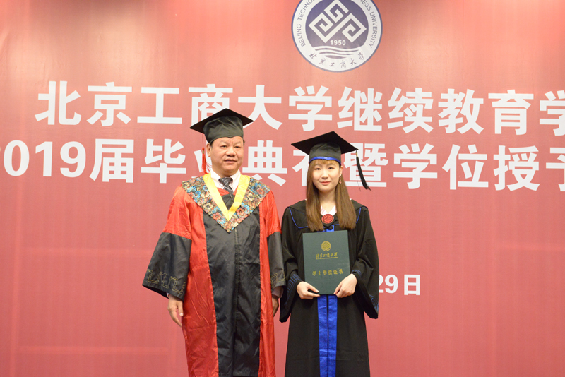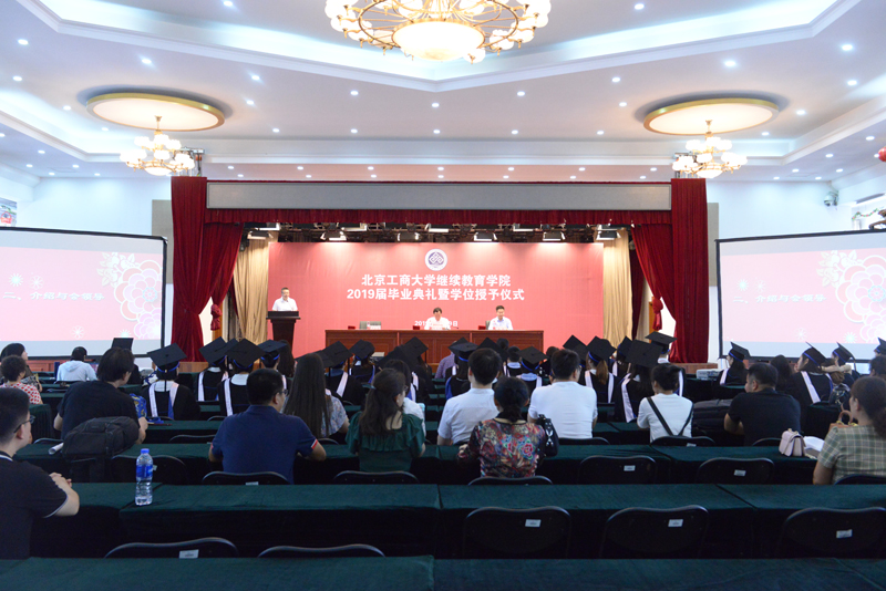 施楓宣讀《北京工商大學繼續教育學院關于2019屆成人教育學生準予畢業及授予學位的決定》《北京工商大學繼續教育學院關于表彰2019年榮譽教師的決定》《北京工商大學繼續教育學院關于表彰2019屆優秀畢業生的決定》《北京工商大學繼續教育學院關于表彰2019屆優秀學生干部的決定》。2019屆共有192人畢業獲得畢業證書,包含應屆、往屆兩類,高起本、專升本、專科三個層次。其中51名學生被授予學士學位。
